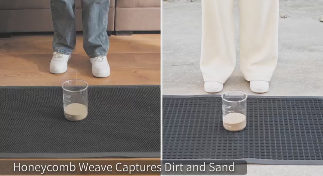 The honeycomb mesh design has tiny holes that trap dirt and dust particles. When you step on it, dirt falls through the mesh and gets locked in the lower layer, keeping your floors clean. The rubber base prevents dirt from escaping underneath.
