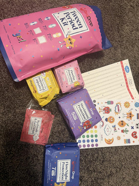 Pads, wipes, pouch & tracker—everything for her first period in one box.